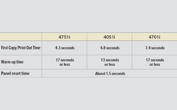 The new bizhub i-Series is fast and always ready to help you out. Fast warm-up times get you started in 17 seconds or less, while speedy First Copy Out Times, or First Print Out Time for the bizhub 4701i, put printed materials in your hands in moments.