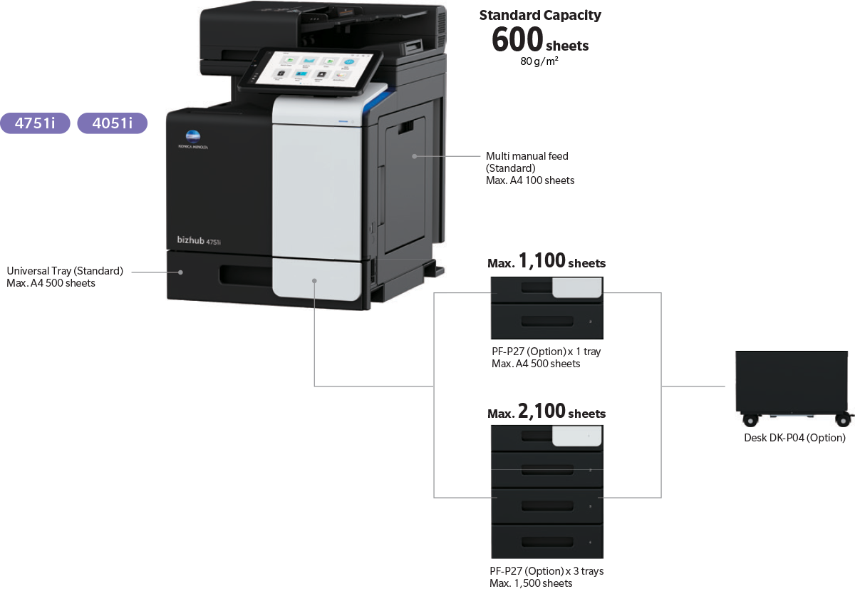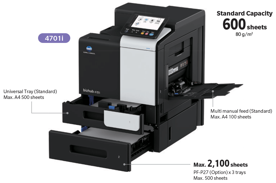 The new bizhub i-Series offers compatibility for custom-sized paper in the front-loading main paper tray. The tray can hold up to 20 post cards or 30 envelopes for easy printing without having to use the side-loading manual feed tray, saving space and increasing efficiency.
