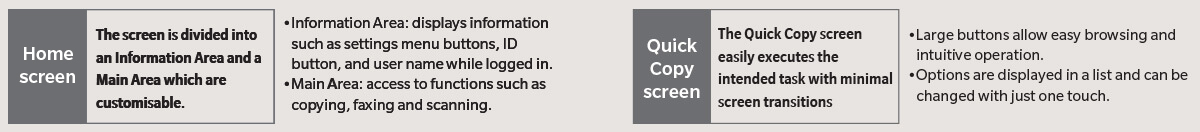 Switch between two user interface setups to match your office needs. Basic Style features streamlined operation with a customisable choice of intuitive copy functions, while Classic Style displays conventional settings and functions for more advanced needs.