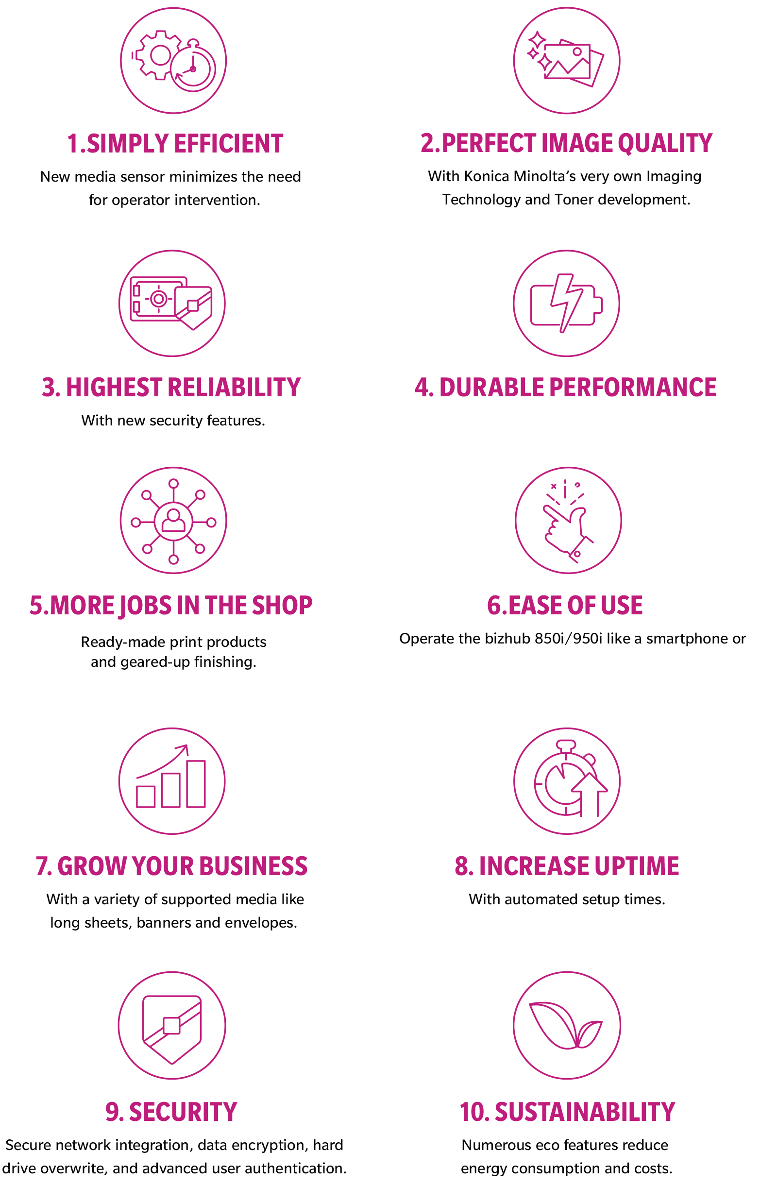 In today’s fast-paced enterprises, simple operability and high-quality performance are preconditions to achieving maximum efficiency and completing all office work quickly and without fuss. At the same time, the full integration with cloud services should provide the right processes at the right time to build more convenient workflows. The bizhub 850i and 950i offers all this and more. On top, it is equipped with the latest security technology to ensure a reliably safe user environment.