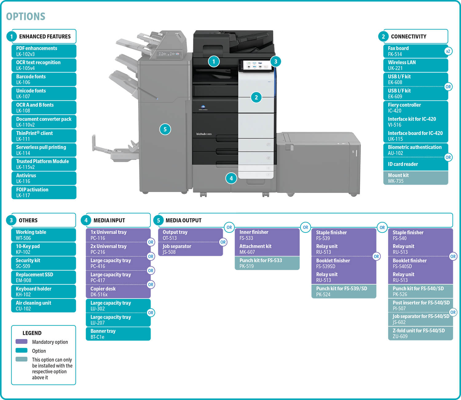 1x 3,000; A4; 52–256 g/m²;1x 2,500; A4-SRA3; custom sizes;banner; 60–300 g/m² |